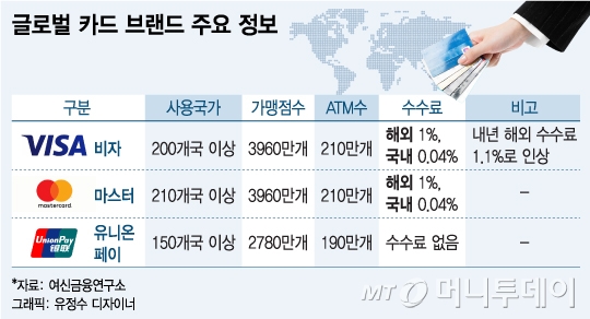 여신금융연구소에 따르면 비자카드와 마스터카드의 해외 가맹점 수는 3960만여곳으로 비슷하다. 이용 가능한 해외 현금지급기(ATM) 수도 210만여개로 거의 같다. 카드 사용이 가능한 국가 수는 마스터카드가 210개국으로 200개국인 비자카드보다 오히려 더 많다.