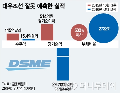 채권단이 '최악의 시나리오'를 근거로 최대 부족자금에 따른 유동성 지원 방안을 내놓은 것은 2015년 10월의 '실패한 전망'을 되풀이하지 않기 위해서다. 당시 정부와 채권단은 2016년 수주 규모를 115억달러로 전망했으나 실제로는 15억4000억달러에 그쳤다. 설상가상으로 1조원대 소난골 드릴십 인도가 지연되면서 유동성 상황은 더 꼬였다. 빗나간 100억달러의 수주전망에 따라 들어올 것으로 예상했던 20%의 선수금 2조원이 날아갔고 소난골 등 드릴십 인도 지연으로 1조4000억원을 못 받으며 3조4000억원의 유동성 부족 사태가 벌어졌다.