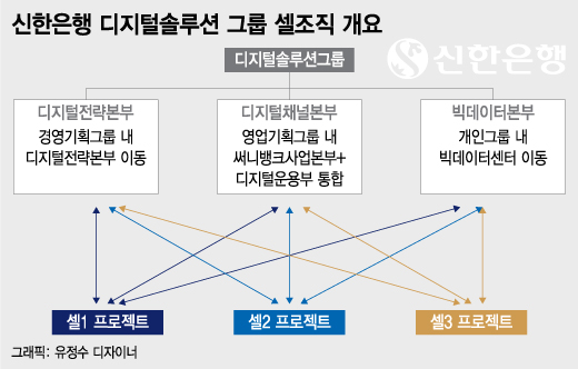 신한은행이 디지털솔루션그룹 내에 셀 조직을 도입하려는 것은 프로젝트의 효율성과 신속성을 높이기 위해서다. 신한은행의 디지털솔루션그룹 밑에는 영업기획그룹 내에 속해있던 디지털운영부와 써니뱅크사업본부가 통합된 디지털채널본부(가칭)가 신설된다. 여기에 경영기획그룹 내 디지털전략본부, 개인그룹 내 빅데이터센터가 이동해 각각 디지털전략본부(가칭)와 빅데이터본부(가칭)로 조직된다.