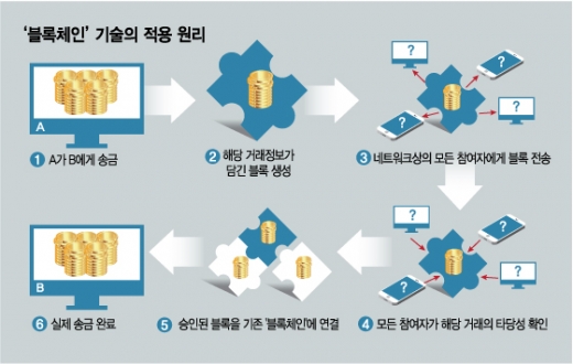 블록체인은 거래정보를 중앙 서버에서 관리하는 은행과 달리 네트워크로 연결된 불특정 다수의 컴퓨터에 분산해 관리하는 기술이다. 블록은 거래기록의 묶음이고 이 블록들이 체인처럼 연결되면 모든 거래기록이 된다. 새 블록은 복잡한 수학 문제를 푼 사람(채굴자)이 생성할 수 있고 이 대가로 채굴자가 얻는 것이 비트코인이다.