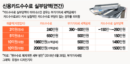 결국 연매출 3억원인 영세가맹점 카드수수료는 240만원이지만 세액공제를 390~500만원 받아 오히려 150~260만원 이득이다. 연매출 5억원인 중소가맹점은 카드수수료로 연간 최대 150만원(월 12만5000원)을 내면 된다.