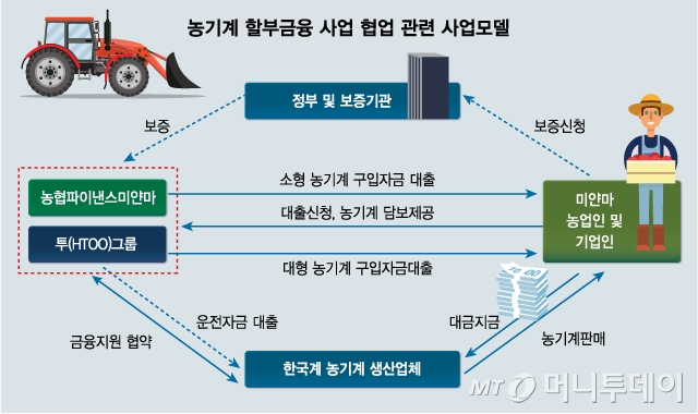 아울러 미얀마 최대 기업인 투(HTOO)그룹과 협업을 통해 농기계 할부금융 사업도 펼칠 계획이다. 농업 종사자나 농업 관련 기업이 한국업체로부터 농기계를 구입할 때 미얀마 정부의 보증을 받아 구입자금을 대출해주는 모델이 검토되고 있다. 농협파이낸스미얀마는 소형 농기계, 투그룹은 대형 농기계에 대한 구입자금 대출을 맡게 된다.