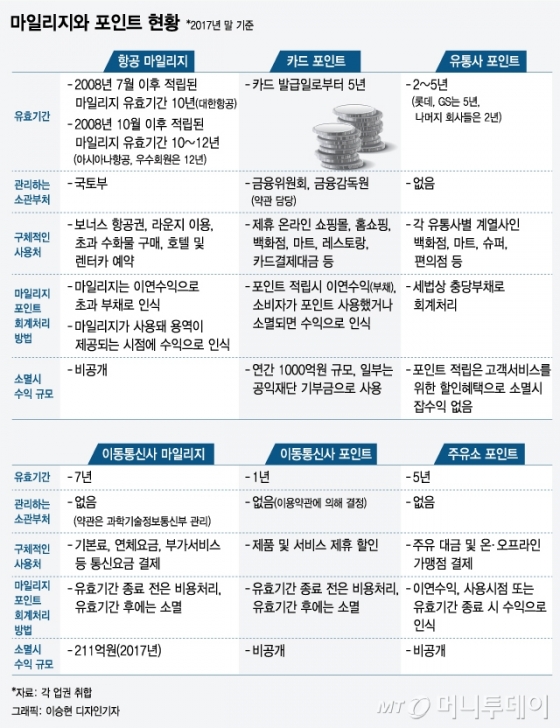 항공사 마일리지는 유효기간이 10~12년으로 가장 길다. 원래 국내 항공사 마일리지는 유효기간이 없었다가 2008년 도입해 내년 1월1일 처음으로 소멸되기 시작한다. 신용카드 포인트는 결제금액에 연동해 적립되는데 카드 유효기간인 5년이 지나면 사라진다. 통신사는 마일리지, 포인트 2개 제도가 있는데 유효기간이 각각 7년, 1년이다. 멤버십포인트 제도를 운용하는 유통사들은 2~5년의 유효기간을 적용한다. 주유소 포인트는 5년간 쓰지 않으면 사라진다.