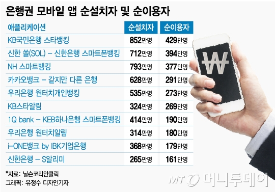 18일 통계·분석업체 닐슨코리안클릭에 따르면 지난달 말 기준 은행 앱 순설치자수는 국민은행 스타뱅킹(852만명)이 가장 많았고 NH농협은행 스마트뱅킹(793만명), 신한은행 쏠(SOL)(712만명), 카카오뱅크 같지만 다른 은행(628만명)이 뒤를 이었다. 이어 우리은행 원터치개인뱅킹(535만명), KEB하나은행 스마트폰뱅킹(414만명), 기업은행 아이원뱅크(368만명) 순이었다. 앱 순설치자수는 앱을 여러번 깔았다 지웠다 하더라도 단 한 번 설치한 것으로 간주해 집계된다.