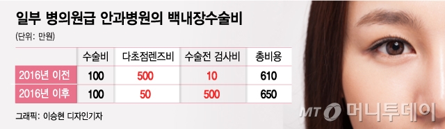 문제는 들쭉날쭉한 진료비다. 시력교정용 다초점렌즈가 실손보험의 보장 대상인지 여부가 논란이 되자, 금감원은 2016년 표준약관을 개정해 보장 대상에서 제외했다. 다만 약관이 모호한 이전 계약은 종전대로 렌즈 가격도 보장해야 한다. 일부 안과병원들은 2016년 이후 다초점렌즈 비용을 50만원으로 낮추는 대신 수술 전 시행하는 2~3가지의 검사비를 300만~500만원 대로 과거보다 10배 가량 올린 것으로 파악된다.