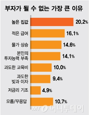 부자가 될 수 없는 가장 큰 요인은 지난해와 마찬가지로 '높은 집값'이었다. 응답자의 20.2%가 자산증식의 방해요인으로 집값을 꼽았다. '적은 급여'가 16.1%로 두 번째로 높게 나온 것도 눈여겨 볼 부분이다. 최저임금 인상, 비정규직의 정규직 전환 등 이번 정부의 소득 인상 정책의 효과가 크지 않았다는 방증으로도 읽힌다. 이외에 부자가 될 수 없는 요인으로는 △물가상승(14.6%) △본인의 투자능력 부족(14.1%) △과도한 교육비(10.0%) △과도한 빚과 이자(9.4%) △저금리 기조(4.9%)로 조사됐다.
