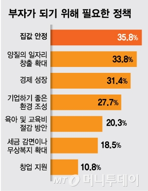 이 때문에 부자가 되기 위해 필요한 정부의 정책으로 '집값 안정(35.8%)'를 답한 사람이 가장 많았다. 특히 내집 마련과 가장 맞닿은 연령층인 30대(47.0%)와 40대(43.6%)에서 이같은 응답률이 가장 높은 것으로 나타났다.