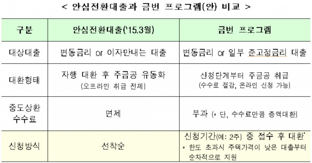 이에 따라 대상은 기존 대출이 변동금리이거나 이자만 갚고 있는 만기일시상환대출인 경우였다. 둘 중 하나만 해당되면 전환 대상이었다.