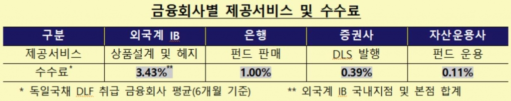 DLF 판매로 인해 은행, 증권, 자산운용 등 금융회사들이 얻는 수수료 합계는 4.93%, 투자자의 약정수익률은 2.02%였다. 고객의 기대수익률은 2%에 불과하지만 금융사들은 2.4배의 수수료를 챙겨간다는 의미다.