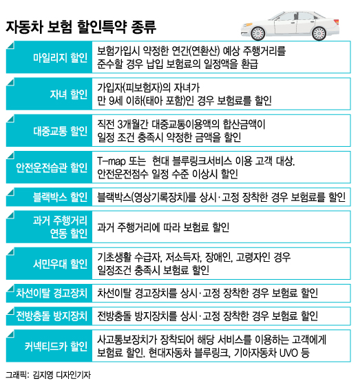 만 9세 이하(태아 포함) 자녀가 있는 경우 할인 혜택을 준다. 블랙박스를 설치하거나 차선이탈 경고장치, 전방충돌 방지장치 등을 설치하면 보험료를 내려준다.