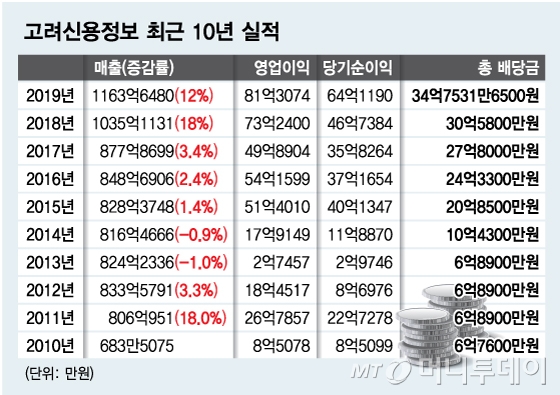 채권추심시장 업계 1위 고려신용정보가 2년 연속 두 자릿수 성장을 이어갔다. 실적이 호조를 보이면서 고려신용 정보는 배당금 규모를 5년 전보다 3배 늘렸다.