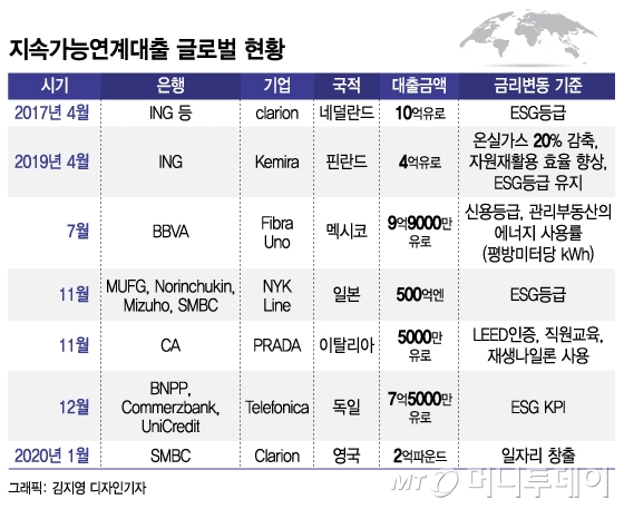 글로벌 은행들은 대출금리 등 기업들의 자금조달에 ESG(환경, 사회적책임, 지배구조)를 반영해 메리트를 주는 지속가능 연계대출, 이른바 ‘착한대출’을 꾸준히 늘려가는 추세다.