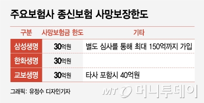 삼성생명의 경우 사망보험금 10억원 이상의 종신보험 가입건수는 연간 600건을 넘어섰다. 보험사들도 사망보험금 한도를 높이는 추세다. 현재 삼성생명, 한화생명, 교보생명 등 주요 생명보험사의 종신보험 사망보험금 한도는 30억원대다. 삼성생명의 경우 별도 심사를 통해 150억원까지 가입하는 경우도 있다.