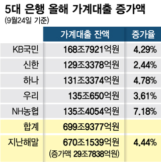 국민은행은 주담대 MCI·MCG 신규 가입을 중단했고, 집단대출(잔금)도 담보 기준을 'KB시세 또는 감정가액'에서 '분양가격'으로 바꿔 대출 한도를 제한했다.농협은행 대출 한시 중단 이후 국민은행으로 대출 수요가 급격히 몰리자 사실상 모든 유형의 가계대출 한도를 줄인 것이다. 국민은행의 가계대출 증가율은 지난 27일 현재 4.28%에 이른다.