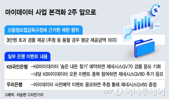 마이데이터 사업 시행을 앞두고 대형은행을 중심으로 경쟁이 치열해져 금융당국이 제동을 걸기로 했다. 감독규정상 행위규칙만으로는 과도한 마케팅 경쟁이 잠잠해지지 않아서다. 현재 제네시스 자동차까지 경품으로 등장한 상황이다. 개인정보를 다루는 사업인 만큼 과당경쟁은 지양해야 한다는 게 금융당국의 입장이다.