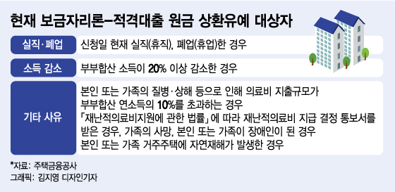 현재 보금자리론과 적격대출은 △실직(휴직)이나 폐업(휴업) △부부합산 소득이 20% 이상 감소 △의료비 지출규모가 부부합산 연소득의 10% 초과 △가족 사망 △본인 또는 가족이 장애인이 된 경우 등에 해당하면 원금 상환유예를 신청할 수 있다.