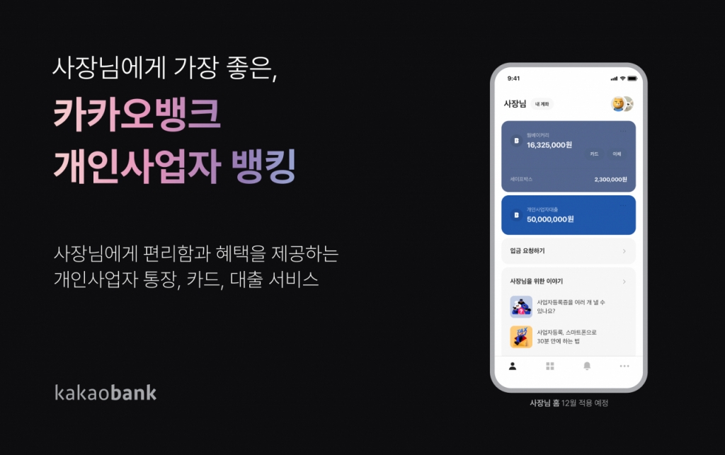 개인사업자 뱅킹은 수신 상품(통장)과 지급결제(카드), 대출을 망라한 풀뱅킹 서비스다. 별도의 앱을 설치할 필요 없이 기존 카카오뱅크 앱에서 이용할 수 있다. 12월 중 '사장님 전용 홈 화면'이 적용될 예정이다.