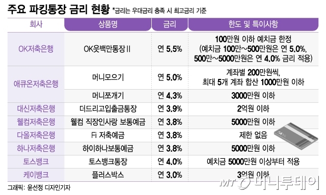애큐온저축은행도 최근 파킹통장인 '머니쪼개기' 금리를 연 4.3%로 0.3%P 인상했다. 한도도 기존 2000만원에서 3000만원으로 상향했다. 별도의 우대금리 조건 없이 하루만 맡겨도 일할 계산된 이자를 받아볼 수 있다.
