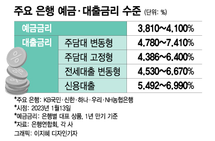 은행들이 지난해 자금(유동성)을 충분히 확보한 상황이라 예금금리를 인위적으로 올릴 필요도 없다. 결국 예금금리는 현재 수준을 당분간 유지하다가 점차 더 떨어질 전망이다. 13일 기준 KB국민·신한·하나·우리·NH농협은행 등 5대 은행의 대표 예금 상품(1년 만기) 최고금리는 3.81~4.1%다.