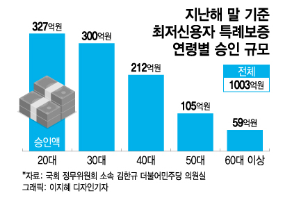 17일 국회 정무위원회 소속 김한규 더불어민주당 의원실이 서민금융진흥원으로부터 받은 자료에 따르면 지난해 승인된 최저신용자 특례보증 1003억원 가운데 62.5%(627억원)이 2030세대가 받은 것으로 나타났다.