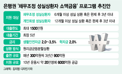은행권이 올해부터 3년간 300억원씩 총 900억원을 신복위에 출연하면 신복위가 그 재원을 바탕으로 채무조정·개인회생 성실상환자에게 저금리로 소액대출을 지원한다.