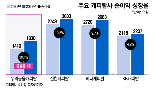 기업별로는 우리금융캐피탈이 가장 높은 성장률을 기록했다. 우리금융캐피탈의 순이익은 2021년 1410억원에서 지난해 1830억원으로 30.4% 뛰었다.