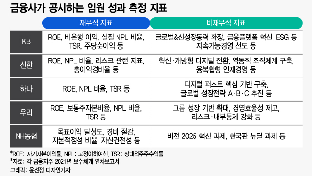 금융당국은 금융사의 임원 보수 산정 체계에 불투명한 측면이 있다고 보고 있다. KB·신한·하나·우리·NH농협금융지주 등 5대 금융지주의 2021년 보수체계 연차보고서를 보면, 임원에 대한 성과 측정 지표와 성과 보수 총액은 명시돼 있지만 개별 임원이 특정 평가 기준에서 어떤 점수를 받았는지 등은 공개돼 있지 않다. 임원 보수를 책정하는 '중간' 과정이 빠진 셈이다.