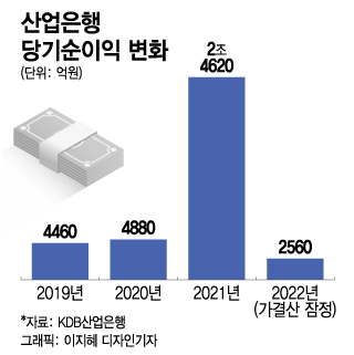 산은의 순이익 급감은 지난해 실적이 유난히 좋았었기 때문에 발생한 기저효과에 기인한다. 산은은 2021년 HMM 전환사채의 주식전환 평가이익(1조8000억원), 대우건설 지분매각에 따른 손상차손 환입 등의 영향으로 당기순이익이 전년보다 5배가량 늘었다.