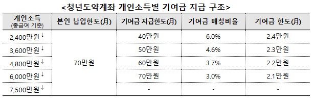 정부기여금은 개인소득 수준, 본인이 납입한 금액(기여금 지급한도)에 따라 지급된다. 소득별 월 기여금 지급한도와 비율(최대 기여금 한도)는 △2400만원 이하 40만원, 6%(2만4000원) △3600만원 이하 50만원 4.6%(2만3000원) △4800만원 이하 60만원, 3.7%(2만2000원) △6000만원 이하 70만원, 3%(2만1000원)이다.