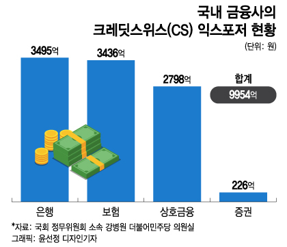 13일 국회 정무위원회 소속 강병원 더불어민주당 의원실이 금융감독원으로부터 제출받은 자료에 따르면 올 2월말 기준 국내 금융사가 보유한 CS 관련 익스포저는 총 9954억원으로 집계됐다. 전체 대외 익스포저 413조9000억원 가운데 0.24% 수준이다.
