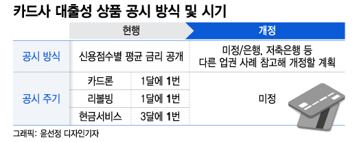 현재 카드사는 매달 여신금융협회를 통해 전달 신규 취급한 카드론과 리볼빙의 신용점수별 금리를 공개한다. 신용점수를 300점 이하부터 900점 초과까지 8개 구간으로 나눠 각 신용점수에 해당하는 차주에게 적용한 금리를 세부적으로 알리는 방식이다. 현금서비스 금리는 카드론·리볼빙 금리와 달리 매달 주기가 아니라 3달에 1번 공시된다. 논의 초기이지만 금감원은 카드사가 금리 관련 정보를 더 구체적으로 공개하도록 할 방안을 검토한다는 방침이다. 은행권 대출금리 공시를 강화한 것과 같은 방식이다.