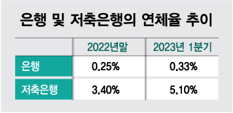 금융사 연체율은 최근 상승일로다. 지난 1분기 국내은행의 연체율은 0.33%로 지난해말보다 0.08%포인트(p) 올랐다. 특히 자영업자 등 개인사업자의 연체율은 같은 기간 0.26%에서 0.37%로 0.11%p 높아졌다. 저축은행의 경우 1분기 연체율이 5.1%로 7년만에 5%대를 넘어섰다.