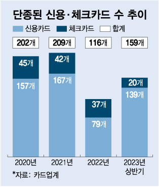 부가서비스 변경이 불가능해 특정 카드 상품이 계속 수익 악화를 초래하자 카드사가 택한 방식은 신규 발급 중단이었다. 일명 '혜자카드'가 사라진 이유다. 통상 카드 단종은 출시된 지 오랜 시간이 흘러 유행에 맞지 않았을 때 이뤄졌는데, 카드사가 수익 악화를 막는 방편으로도 쓰이고 있다. 카드업계에 따르면 2020년 202개, 2021년 209개, 지난해 116개의 신용·체크카드가 단종됐는데, 올해엔 상반기에만 159개가 신규 발급이 중지됐다.