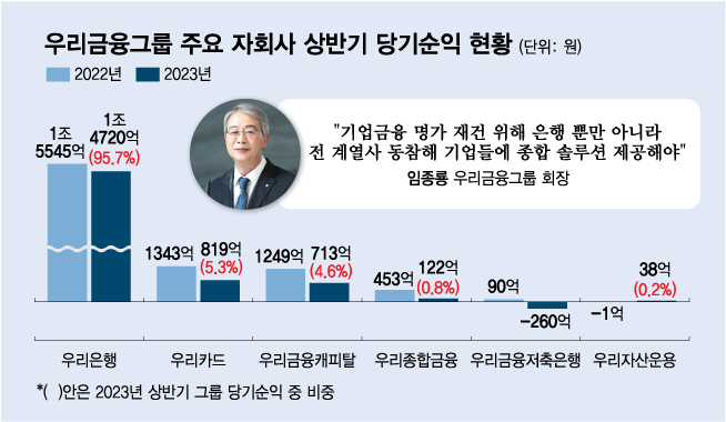 임종룡 우리금융그룹 회장이 상반기 부진한 실적을 거둔 직후, 은행을 제외한 주요 계열사를 방문했다. 상반기 은행 의존도가 심화하면서 하반기 비은행 부문에 힘을 싣고 계열사 간 시너지를 높이기 위한 행보로 풀이된다.