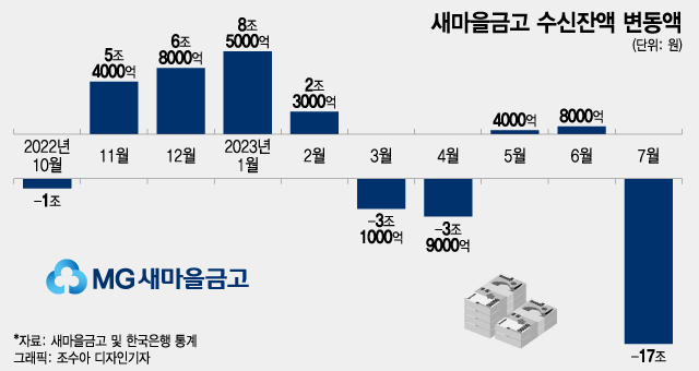 새마을금고의 뱅크런(대규모 예금인출) 사태로 지난달에만 17조원이 이탈한 것으로 나타났다. 역대급 자금이탈로 금융시장이 한 때 요동쳤지만 연 6~7%대 고금리예금 위주로 빠져나가 새마을금고의 수익성은 도리어 개선됐다는 해석이 나온다.