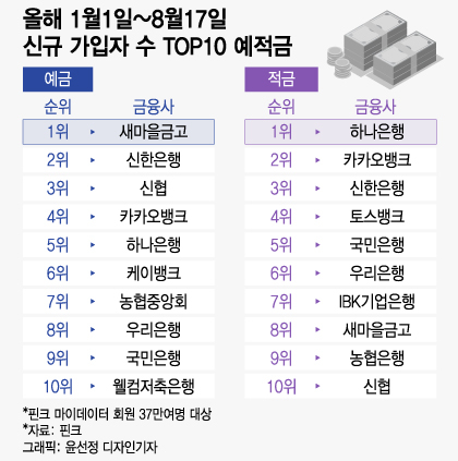 올해 1~8월 가장 많은 예금 가입자를 유치한 금융사는 새마을금고로 조사됐다. 지난달초 뱅크런 우려가 일긴 했으나 매력적인 고금리로 상반기 동안 다수의 예금자에게 선택을 받은 것으로 분석된다. 적금에 있어선 획기적인 상품을 선보인 인터넷은행(인뱅)이 강세를 보였다.