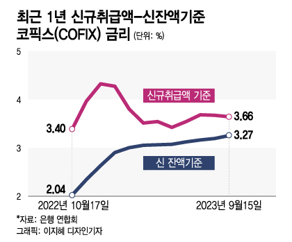 29일 금융권에 따르면 지난 5일 은행연합회가 공시한 신규취급액기준(이하 신규) 코픽스는 3.66%로 전월보다 0.03%포인트(p) 하락했다. 두 달 연속 하락이다. 반면 신잔액기준(이하 신잔액) 코픽스는 3.27%로 2021년 8월부터 줄곧 오르고 있다. 올해 초 1.37%p였던 신규와 신잔액 코픽스 차이는 이달 0.39%p까지 좁혀졌다.