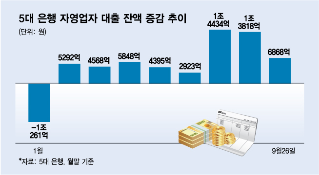 3일 금융권에 따르면 5대 은행(KB국민·신한·하나·우리·NH농협)의 지난달 26일 기준 자영업자 대출잔액은 318조8796억원으로 집계됐다. 전달(318조1928억원) 대비 6868억원 늘어난 수치로 올해 1월 이후 8개월 연속 증가세다. 26일까지 집계된 증가폭도 지난 7월(1조4434억원), 8월(1조3818억원)에 이어 올해 들어 세 번째로 많다.
