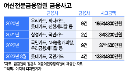 국회 정무위원회 소속 강훈식 더불어민주당 의원이 금감원에 받은 자료에 따르면 지난 2020년에서 올해 8월까지 여전업권에선 총 24건, 369억3300억원 규모의 금융사고가 발행했다. 최근에는 중고 상용차 대출 관련 금융사고가 빈번했다. 강 의원은 금감원 국감에서 "타업권과 달리 여전사 내부통제 방안이 눈에 띄지 않는다. 카드, 캐피탈 중고 상용차 대출관련 금융사고가 많았는데 여전사 내부통제가 소홀한 게 아니냐"고 지적했다. 이에 대해 이복현 금감원장은 "여전사는 구조상 고객돈을 수십억 횡령하는 경우가 많지 않아 간이한 형태로 시스템이 돼 있었다. 반성적으로 볼 때 아쉽다"고 답했다. 금감원은 조만간 여전업권 내부통제 후속 방안을 발표할 예정이다.