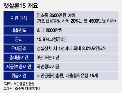 올해 300억원을 출연하고, 향후 2026년까지 200억원씩 국민행복기금에 출연하는 방식이다. 햇살론15는 국민행복기금의 신용보증을 통해 대출이 진행된다. 햇살론15는 연소득 3500만원 이하(개인신용평점 하위 20%는 연 4500만원 이하)인 근로자를 대상으로 최대 2000만원을 연 15.9%의 금리로 대출해주는 상품이다.
