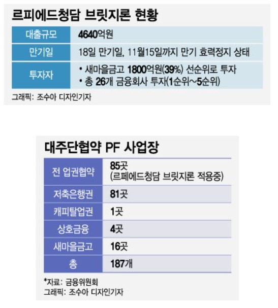 청담동 노른자위 땅에 고급 주거단지를 짓는 청담동 PF의 만기는 당초 지난달 17일이었다. 하지만 전체 채권액의 39%(1800억원)를 지원한 새마을금고가 만기연장에 반대해 사업이 좌초 위기까지 몰렸다. 총 26개 채권자로 구성된 브릿지론에서 전체 채권액의 3분의2 이상 동의가 있어야만 만기가 연장되기 때문이다. 이에 지난달 채권자 조정위원회에서 20영업일간 만기 효력정지를 결정하면서 오는 14일까지 사실상 만기를 연장해 놓았다.