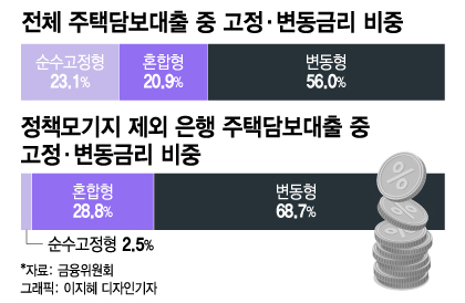 금융당국이 혼합형까지 DSR 규제 강화 방안에 넣으려는 것은 가계부채 증가 속도를 줄이기 위한 목적도 있지만 가계부채 질 개선 차원도 작지 않다. 급격한 금리 변동에 따라 가계부채 위험도가 심화되는 문제를 해결하기 위해선 고정금리 대출을 늘려야 한다. 당국은 내년 3월쯤 순수 장기·고정금리 대출에 인센티브를 주는 '신(新) 고정금리·분할상환 행정지도'를 발표한다. 그동안 정책적으로 고정금리로 간주했던 혼합형 주담대를 줄이고 순수 고정금리를 확대하기 위한 첫 대책이다.