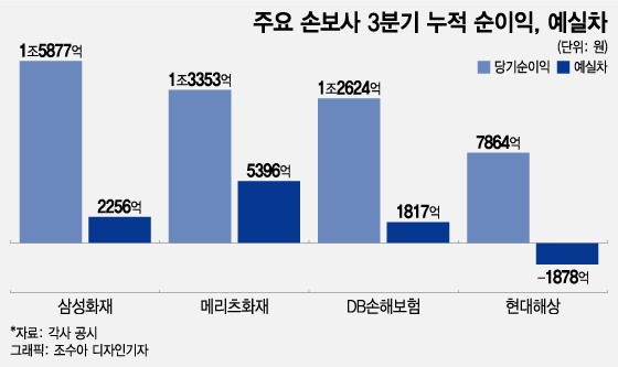 하지만 일부 보험사의 예실차가 3분기 누적 기준 수천억원에 달했다. 메리츠화재가 5396억원으로 가장 많았고 이어 삼성화재 2256억원, DB손해보험 1817억원 발생했다. 메리츠화재는 같은 기간 당기순이익이 1조3353억원인데 40% 가량이 이익으로 전환한 예실차인 셈이다. 삼성화재(순이익 1조5877억원)는 14%였다.