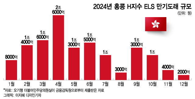 내년 3월~4월은 홍콩 ELS 만기도래 규모가 가장 많은 달이다. 내년 1월 8000억원, 2월 1조4000억원 규모로 만기가 도래하며 3월에는 1조6000억원, 4월에는 2조6000억원 규모로 점정을 찍는다. 5월과 6월에도 각각 1조3000억원, 1조5000억원의 만기가 도래한다. 약 14조원 가운데 상반기에만 약 9조원이 쏠려 있다.