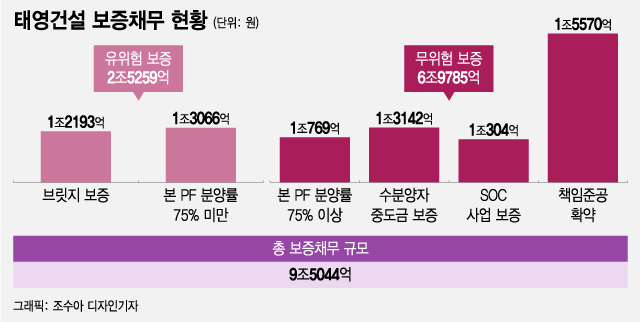 13일 금융권에 따르면 태영건설의 PF 대출 보증채무 규모는 4조6332억원으로 이중 절반이 넘는 2조5259억원이 높은 우발채무의 위험을 갖고 있다. 브릿지론과 본PF 중 분양률 75% 미만인 보증채무가 각각 1조2193억원, 1조3066억원을 차지한다.