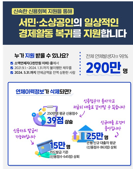 정부가 코로나19 확산 기간 동안 연체한 대출을 전액 상환하면 연체기록을 삭제해 주는 '신용사면'을 실시한다. 총 290만명이 신용사면 대상으로 이 가운데 15만명은 신용카드 발급이 가능해지고 25만명은 은행 대출을 받을 수 있게 된다.