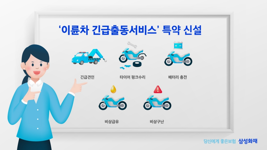 삼성화재는 현재 승용·화물 자동차 등의 차종만 가입이 가능한 긴급출동 서비스 특약을 업계 최초로 이륜차에도 확대 신설한다고 2일 밝혔다.