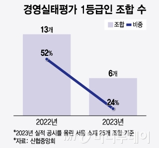 6일 신협중앙회에 따르면 지난해 실적을 공시한 서울 소재 조합 25개 중 최근 경영실태평가에서 1등급을 받은 조합은 6개(24%)로 나타났다. 2022년 결산 땐 절반이 넘는 13개(52%) 조합이 1등급을 받았다. 25개 조합 중 9개 조합은 1년 전보다 등급이 떨어졌다. 8개 조합이 1등급에서 2등급으로 하락했고 2등급에서 3등급도 떨어진 조합도 1곳이다.