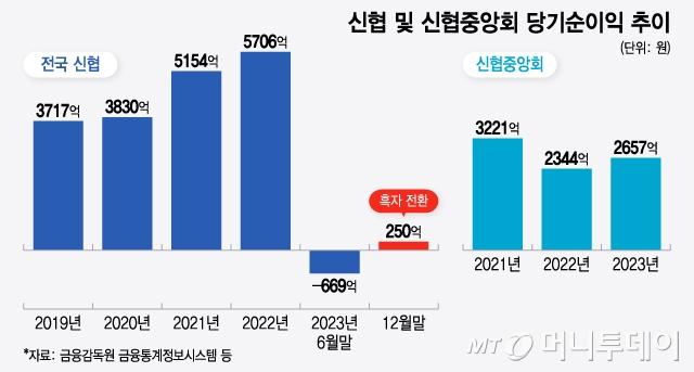 신협과 별개로 지난해 중앙회도 2657억원의 순이익을 올리며 흑자를 유지했다. 중앙회의 순이익은 2022년 2344억원보다 13% 증가했다. 중앙회는 신용사업과 공제사업을 통해 지난해 800억원 규모의 순이익을 낸 것으로 전해졌다.