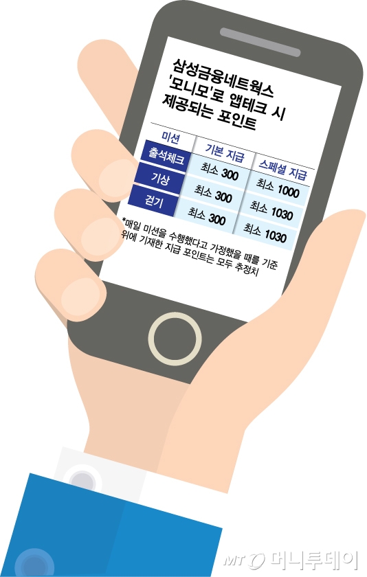 앱테크를 즐겨 하는 A씨는 지난해 8월부터 올해 1월까지 약 6개월간 삼성금융네트웍스(삼성증권·삼성생명·삼성화재·삼성카드) 앱 '모니모'를 이용해 6만여원을 벌었다. A씨는 매일 모니모 앱에 접속해 출석체크를 하고 기상 미션과 걷기 미션 등에 참여했다. 모니모는 미션을 성공했을 때 지급하는 포인트 규모가 커 다른 금융 앱보다 빠르게 돈을 벌 수 있었다.